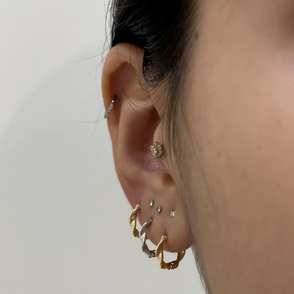 • Banho de ouro 18k (primeiro e terceiro furo) e Ródio Branco (segundo furo)