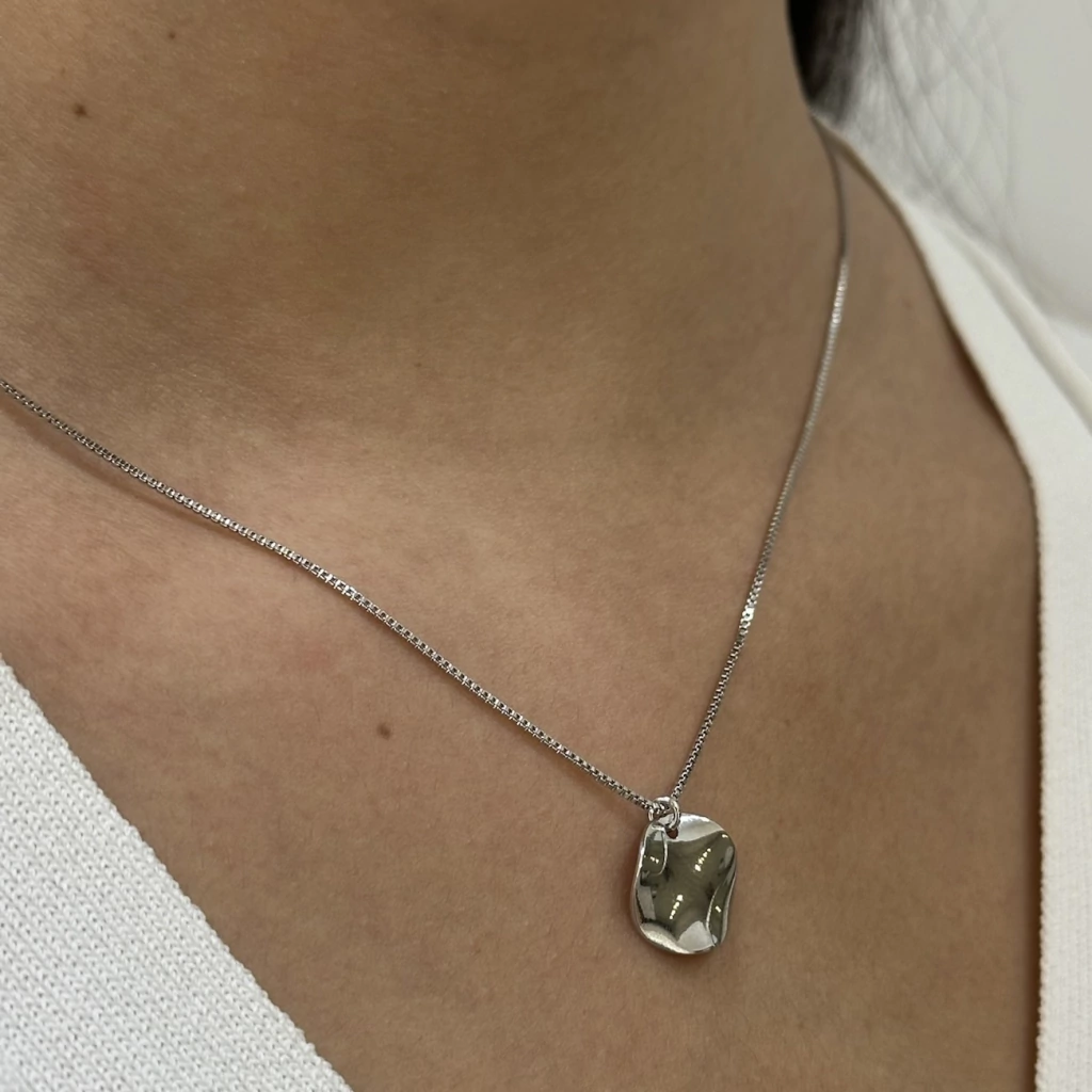 O Colar Chapa Ondulada banhado a ródio branco combina simplicidade e sofisticação em um design com movimento e brilho na medida certa. Seu pingente curvado com acabamento liso traz um toque moderno e versátil, ideal para elevar qualquer produção com elegância sutil.