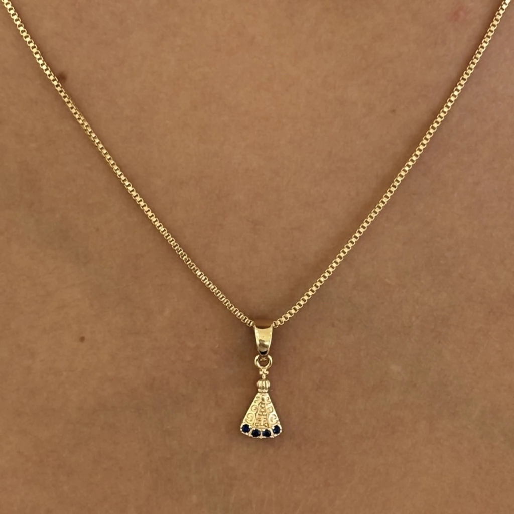 Para quem carrega o amor sempre por perto. O Colar Mini Nossa Senhora Dourado banhado a ouro 18k é a escolha perfeita para quem busca elegância e significado em cada detalhe.