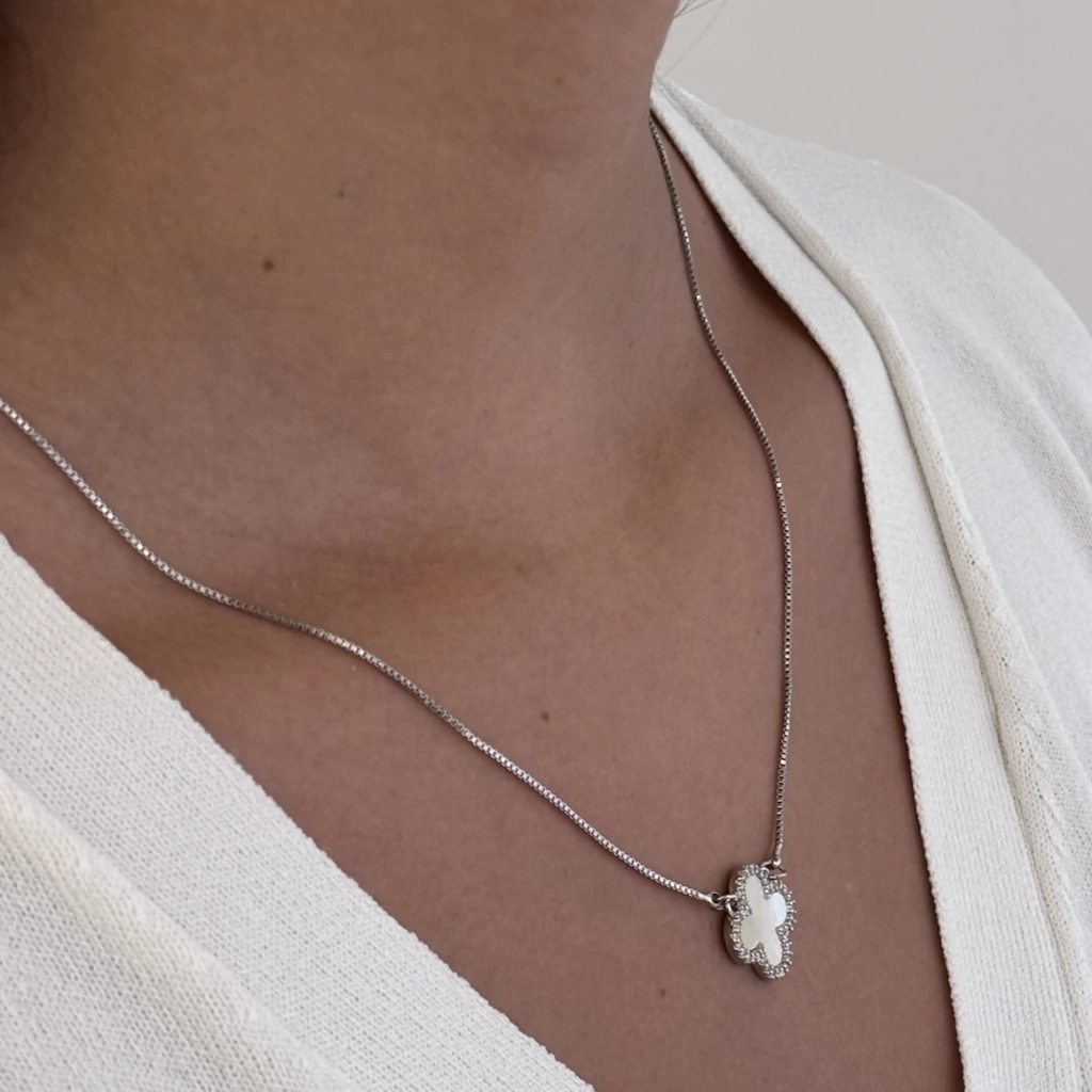 Sorte e elegância em uma só joia! O Colar Trevo Madrepérola Lateral Cravejada banhado a Ródio Branco combina delicadeza e significado em um design sofisticado. O pingente em forma de trevo com centro de madrepérola e contorno de microzircônias simboliza proteção e boas energias, perfeito para presentear ou usar como um amuleto moderno e cheio de charme.