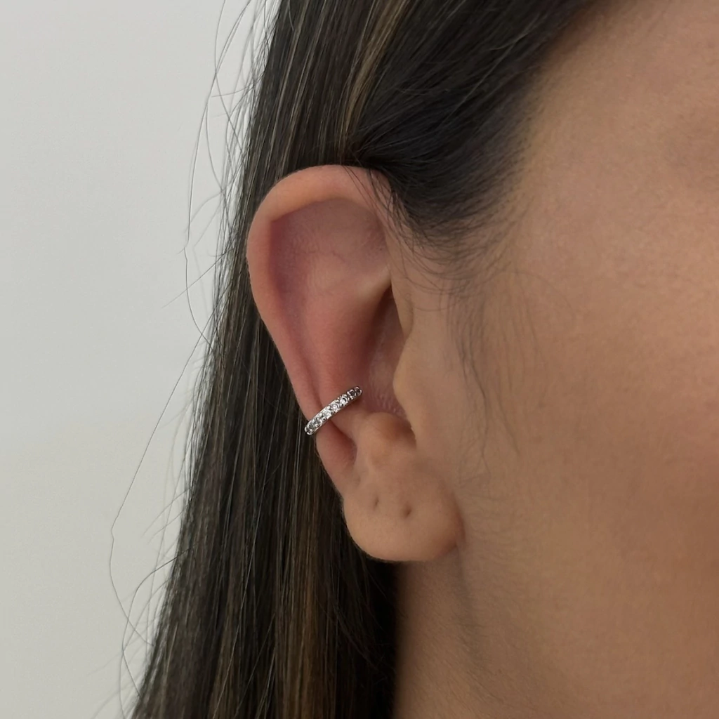 Brilho discreto, impacto certeiro! O Piercing Fake Fino Cravejado banhado a Ródio Branco combina delicadeza e sofisticação em um design elegante e atemporal. Com microzircônias cravejadas por toda a extensão, ele ilumina a região do conch da orelha com sutileza e glamour, sem precisar de furo. Um acessório versátil, perfeito para quem ama detalhes com charme.