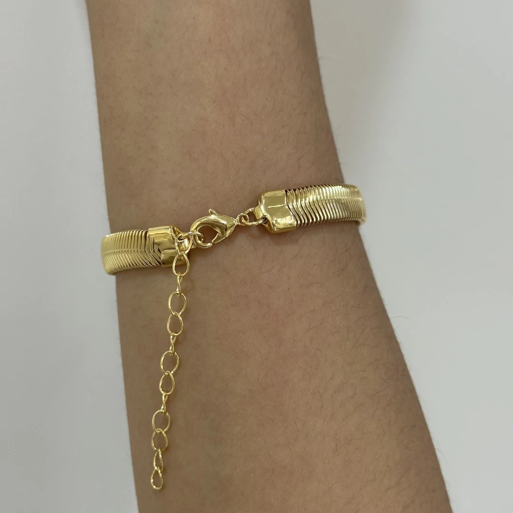 Elegância e movimento em cada detalhe! A Pulseira Malha Snake banhada a ouro 18k possui um caimento flexível e sofisticado que se adapta perfeitamente ao pulso. Com acabamento espelhado e visual contemporâneo, é a escolha certa para quem busca uma peça marcante e versátil.